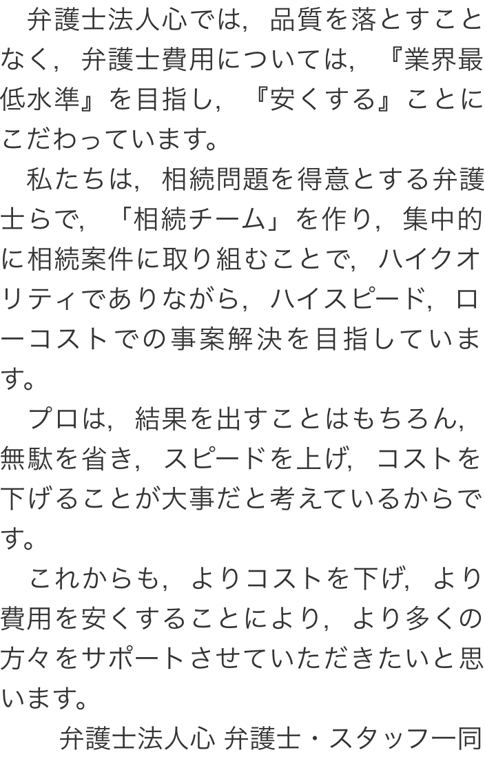 トップその他費用の安さにこだわる理由 階層構造▼ その他(目次) 費用の安さにこだわる理由 その他(目次)その他トップ心グループニュース相続放棄の電話相談・テレビ電話相談弁護士費用(詳細)費用の安さにこだわる理由お客様相談室その他の地域情報地域に関するQ&Aお役立ちリンク集関連リンク集プライバシーポリシー 受付時間 平日 9時~21時、土日祝 9時~18時 夜間・土日祝の相談も対応します (要予約) 所在地 〒260-0045 千葉県千葉市中央区弁天1-15-3リードシー千葉駅前ビル8F (千葉弁護士会所属) 0120-41-2403 お問合せ・アクセス・地図 お役立ちリンク